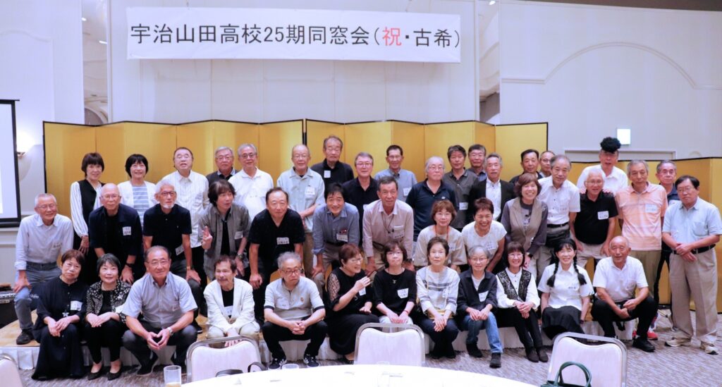 山高25期は、古希の節目を迎え、令和6年9月22日に7年振りに同窓会を開催いたしました。コロナ禍で開催できなかった時期があり、今回は142名の参加を得て開催しました。昔の懐かしい映像が映され、徐々に高校時代のことが思い出されて、話も尽きないうちに、楽しいひとときは閉会の時間を迎えました。今回が最後の同窓会ということで開催しましたが、次の同窓会を期待する声もあがり、含みを持たせ終了いたしました。またいつか、皆さまにお会いする日を楽しみにしています。